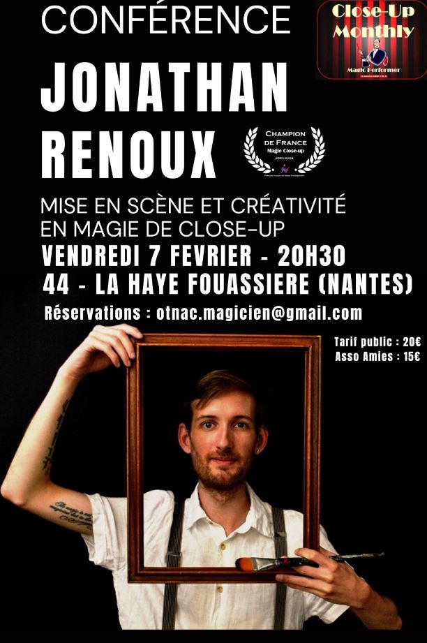L’Association de magie Close Up Monthly aura la joie d’accueillir notre ami Jonathan Renoux, champion de France de Magie close up 2023, pour une conférence le vendredi 07 février à la Haye Fouassière. Dans...