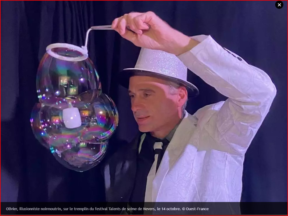 Avant-premiere par Olivier Spectacle de 45 mn d’illusion et de magie avec des bulles de savon Jeudi 25 avril 21h48 rue de la chesselière85160 Saint Jean de Monts Olivier premier prix au festival talents...